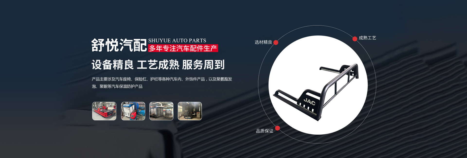揚(yáng)州舒悅汽配有限公司經(jīng)過多年的穩(wěn)定發(fā)展,業(yè)績(jī)一直蒸蒸日上。公司產(chǎn)品主要涉及汽車座椅、保險(xiǎn)杠、護(hù)欄等各種汽車內(nèi)、外飾件產(chǎn)品,以及聚氨酯發(fā)泡、聚脲等汽車保溫防護(hù)產(chǎn)品。其主要是為江淮、金龍,奇瑞等公司服務(wù),已連續(xù)多年成為江淮、金龍等公司的A級(jí)供應(yīng)商。        公司成立于1997年,現(xiàn)坐落于揚(yáng)州市儀征劉集盤古工業(yè)集中區(qū)202號(hào),公司占地面積26640平 方米,廠房建筑面積18512平方米。公司擁有先進(jìn)的制造設(shè)備、可靠的生產(chǎn)工藝、完善的檢測(cè)手段和科學(xué)的管理,在售前和售后服務(wù)中做到快速反應(yīng),應(yīng)急應(yīng)變,為客戶提供優(yōu)良產(chǎn)品和滿意服務(wù)。公司的產(chǎn)品開發(fā)能力和生產(chǎn)規(guī)模在同行業(yè)中處于前列的地位。        揚(yáng)州舒悅?cè)吮小罢\(chéng)信雙嬴”的原則,發(fā)揚(yáng)“誠(chéng)信、務(wù)實(shí)、創(chuàng)新、貢獻(xiàn)”的企業(yè)精神,恪守“顧客至上”的經(jīng)營(yíng)宗旨,致精從業(yè),不斷引進(jìn)新技術(shù)、新材料。以優(yōu)良的產(chǎn)品、合理的價(jià)格和周到的服務(wù)參與市場(chǎng)競(jìng)爭(zhēng)。公司愿與國(guó)內(nèi)外朋友建立真誠(chéng)的合作伙伴關(guān)系,攜手共創(chuàng)輝煌!